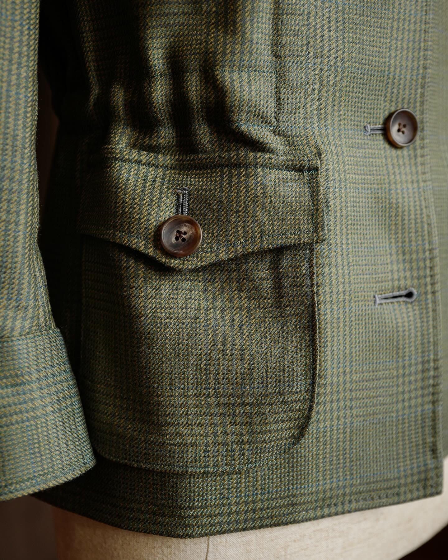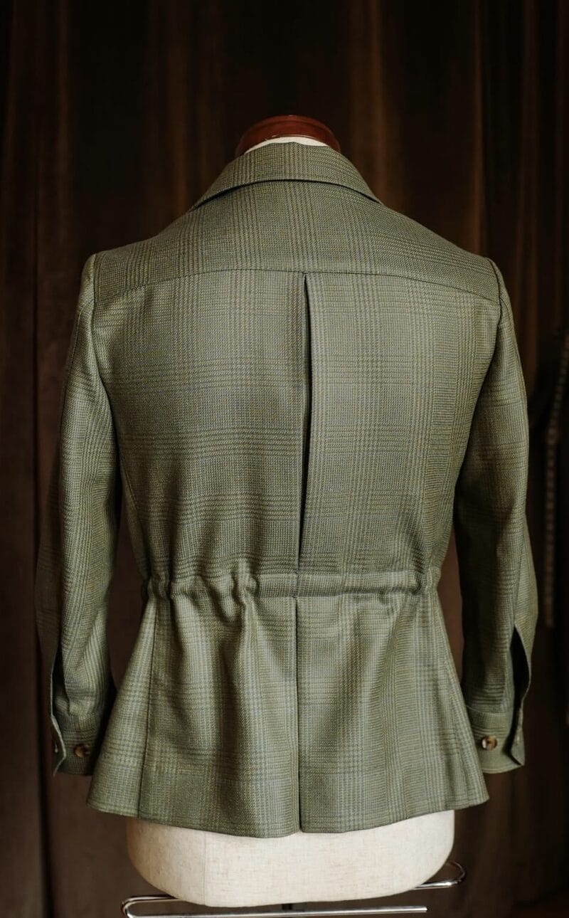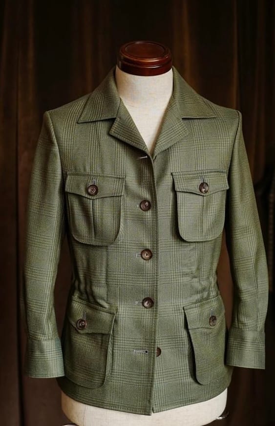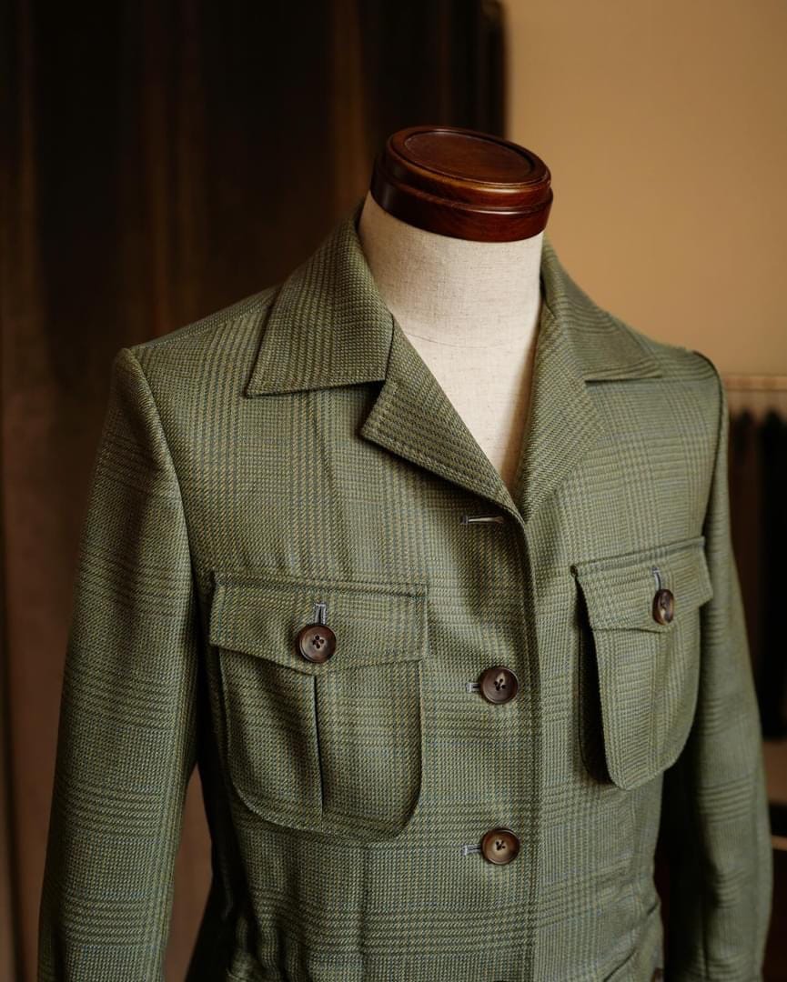 From our exclusive safari collection, this jacket us crafted from unique vintage fabric sourced from Dormeuil. its rich green hue and timeless design make it a standout piece for both adventure and style.
